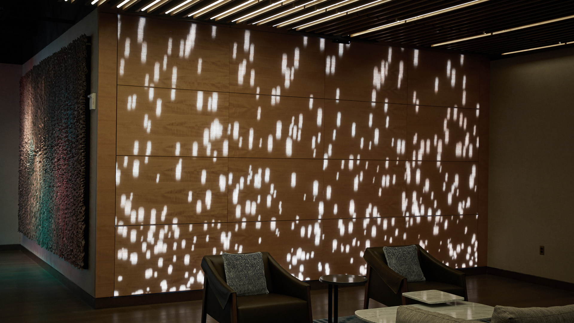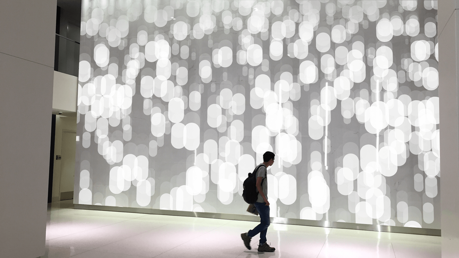 The Dynamic Wall is an array of LEDs that can be installed behind a wide variety of materials. It is easily configured to enable a range of experiences that delight and surprise visitors. Examples include ambient patterns that react when people walk by, time sensitive messages, and game-like interactions.